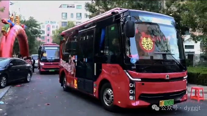 這兩輛公交車跟隨著迎親隊伍,高調得“秀恩愛”,吸引了無數的目光和祝福。寬敞的車廂,可以輕松容納一眾親朋好友,笑聲、祝福聲此起彼伏,為新人的幸福時刻,增添了更多的溫馨色彩。